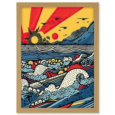 Artery8 Seascape Sunset Comic Book Style Geometric Pattern Waves Polka Dot Halftone Artwork Framed A3 Wall Art Print