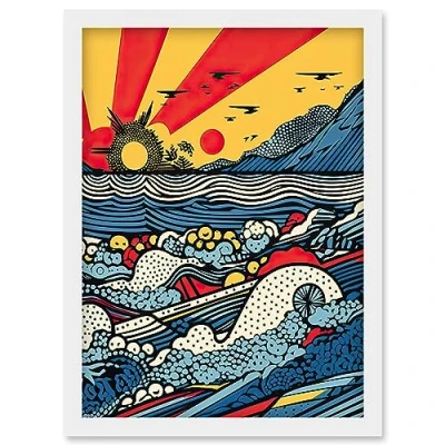 Artery8 Seascape Sunset Comic Book Style Geometric Pattern Waves Polka Dot Halftone Artwork Framed Wall Art Print A4