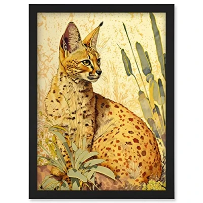 Artery8 Serval Cat in Nature Detailed Watercolour and Ink Bright Illustration Artwork Framed Wall Art Print A4