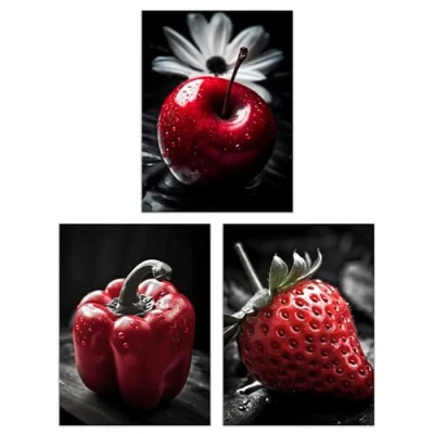Artery8 Set of 3 A4 Red Apple Pepper Strawberry on Black and White Photograph Kitchen Artwork Unframed Wall Art Living Room Poster Prints Pack