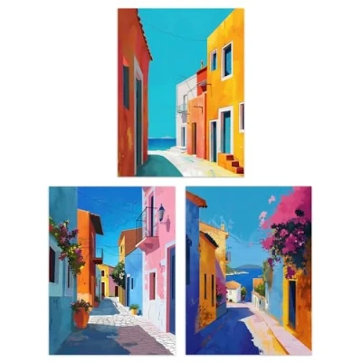 Artery8 Set of 3 Colourful Greek Coastal Street Paintings Living Room 12X16 Inch Wall Art Prints Pack