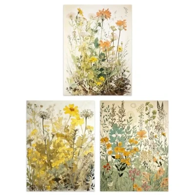 Artery8 Set of 3 Wildflowers Vintage Pastel Colour Floral Artworks Yellow Pink Teal Spring Flower Field Unframed Wall Art Living Room Poster Prints Pack