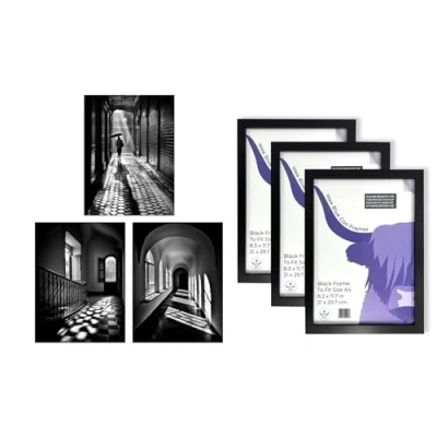 Framed Art Pack: This top-tier collection features 3 high quality, unframed wall art prints and 3 engineered wood frames. Each print is printed onto thick, luxurious art paper. Size: Each elegant piece is A4 sized and measures 29.7 x 21 cm (8.3 x 11.7 inches). Care & Quality: Please note that some assembly is required and that there may be some variation in the colour of the on-screen image and the actual item received. This is subject to the brightness and contrast of your screen settings. Versatility: These prints provide an aesthetic uplift to any space - be it living rooms, home offices, bedrooms, bathrooms, kitchens, and even B&Bs or traditional office environments. With our wide range of art styles from abstract to modern, classical, and more, there's something to cater to every art enthusiast's taste. Ideal Gift: Our art prints make a perfect, thoughtful gift for occasions like birthdays, Mothers Day, Christmas, Anniversary, or a housewarming present.