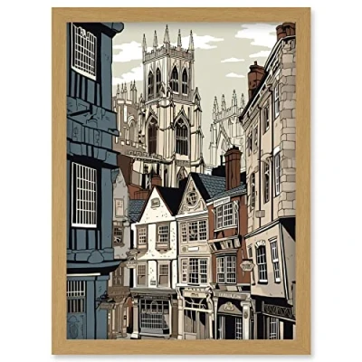 Artery8 Shambles Street Cityscape with York Minster Towers Artwork Framed Wall Art Print A4