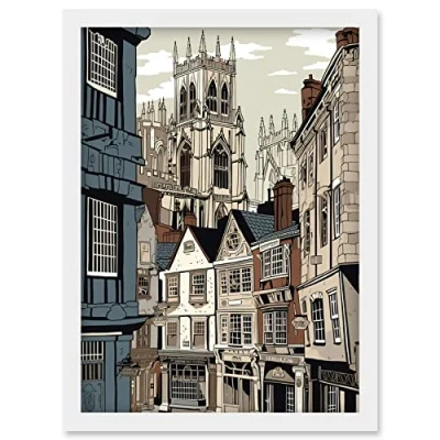 Artery8 Shambles Street Cityscape with York Minster Towers Artwork Framed Wall Art Print A4