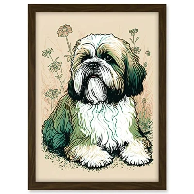 Artery8 Shih Tzu Dog with Daisies Modern Multicoloured Linocut Illustration Artwork Framed A3 Wall Art Print