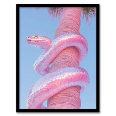 Artery8 Shiny Chrome Pink Snake Wrapped On Palm Tree Bark Living Room Artwork Framed Wall Art Print A4
