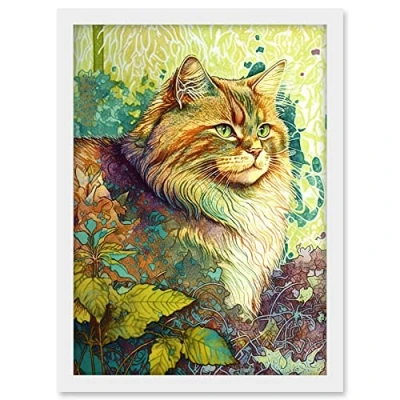 Artery8 Siberian Cat in Nature Vibrant Colourful Modern Portrait Illustration Artwork Framed A3 Wall Art Print