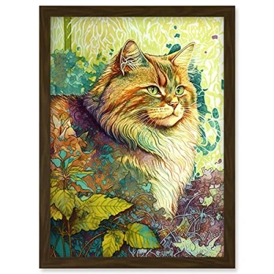 Artery8 Siberian Cat in Nature Vibrant Colourful Modern Portrait Illustration Artwork Framed Wall Art Print A4