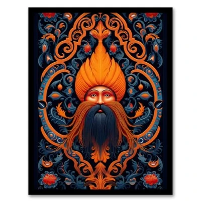 Artery8 Sikh Guru and Botanical Pattern Vibrant Concept Art Orange Blue Vegetal Design Artwork Framed Wall Print A4