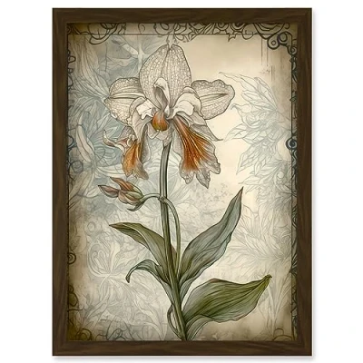 Artery8 Single Orchid Flower Pastel Colour Art Nouveau Artwork Framed Wall Print A4