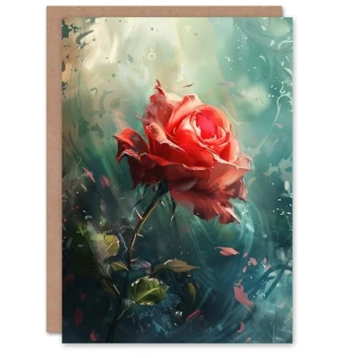 Artery8 Single Red Rose Flower Morning Mist Painting Greeting Birthday Card Him Her All Blank