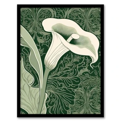 Artery8 Single White Cala Lily Flower Art Nouveau Painting Green Organic Decorative Patterns Nature Colourful Bright Floral Modern Artwork Framed Wall Print A4