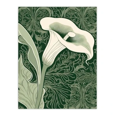 Artery8 Single White Cala Lily Flower Art Nouveau Painting Green Organic Decorative Patterns Nature Colourful Bright Floral Modern Artwork Large Wall Poster Print Thick Paper 18X24 Inch