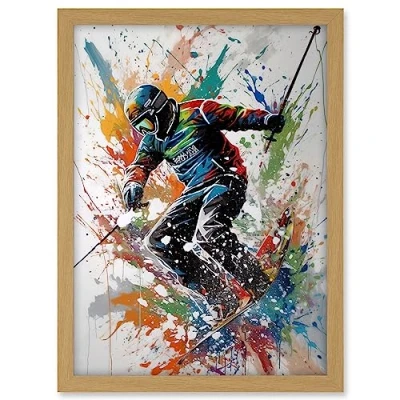 Artery8 Skier Skiing Multicoloured Paint Splat Action Shot Artwork Framed A3 Wall Art Print