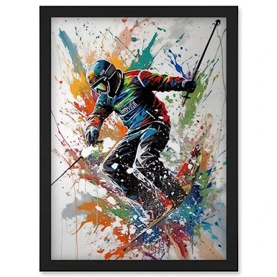 Artery8 Skier Skiing Multicoloured Paint Splat Action Shot Artwork Framed Wall Art Print A4