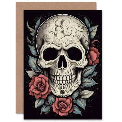 Artery8 Skull and Roses Old School Tattoo Ink for Wife Her Mum Sister Daughter Mom Gran Nan Birthday Thank You Congratulations Blank Art Greeting Card
