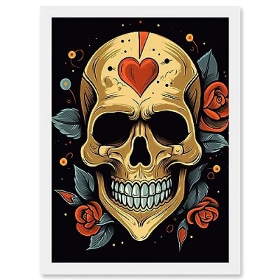 Artery8 Skull Heart and Roses Tattoo Ink Body Art Rockabilly Americana 50s Artwork Framed Wall Print A4