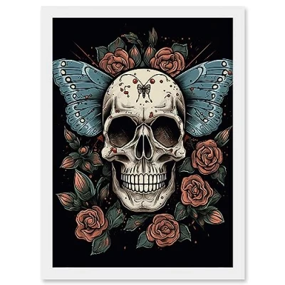 Artery8 Skull Moth and Roses Tattoo Ink Body Art Rockabilly Americana 50s Artwork Framed A3 Wall Print