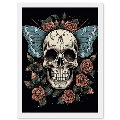 Artery8 Skull Moth and Roses Tattoo Ink Body Art Rockabilly Americana 50s Artwork Framed Wall Print A4