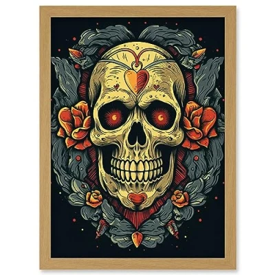 Artery8 Skull Roses and Heart Tattoo Ink Body Art Rockabilly Americana 50s Artwork Framed Wall Print A4