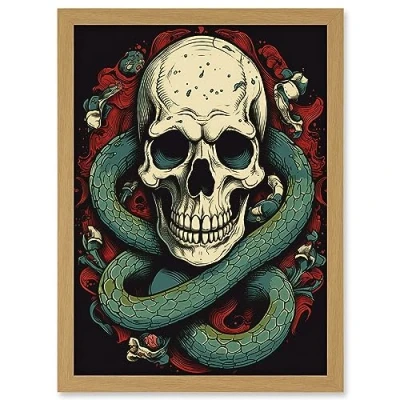 Artery8 Skull Snake and Flowers Tattoo Ink Body Art Rockabilly Americana 50s Artwork Framed A3 Wall Print