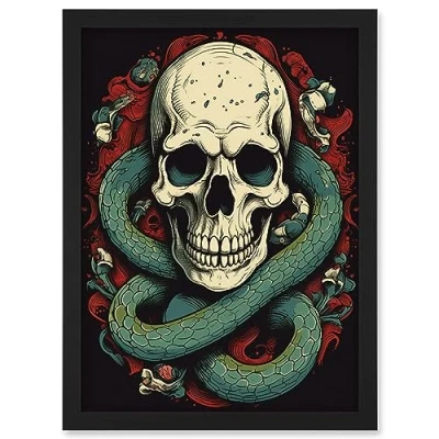 Artery8 Skull Snake and Flowers Tattoo Ink Body Art Rockabilly Americana 50s Artwork Framed Wall Print A4