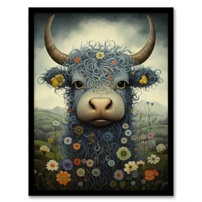 Artery8 Small Blue Highland Cow In Wildflower Meadow Fun Wee Coo Artwork Framed Wall Art Print A4