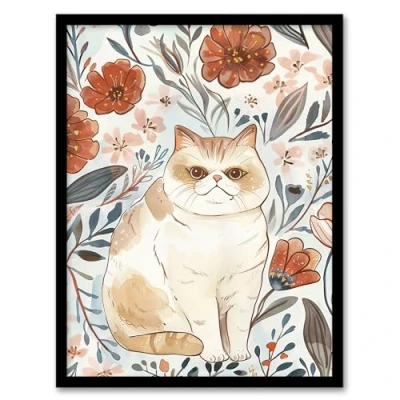 Artery8 Smiling Exotic Shorthair Cat Floral Watercolour Living Room Artwork Framed Wall Art Print A4