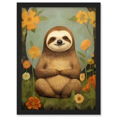 Artery8 Smiling Sloth Meditating in Forest Flowers Kids Bedroom Artwork Framed A3 Wall Art Print