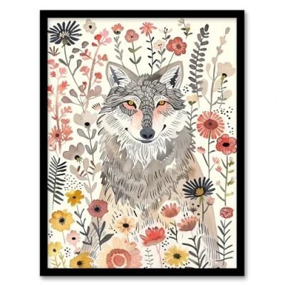 Artery8 Smiling Wolf Wildflower Meadow Floral Watercolour Living Room Artwork Framed Wall Art Print A4
