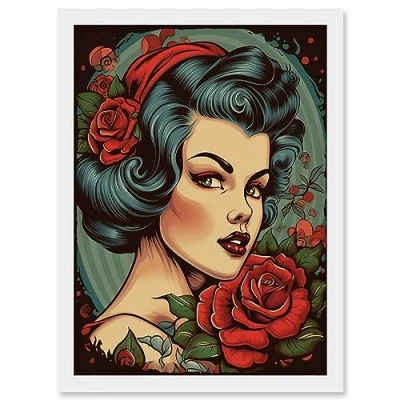 Artery8 Snow White Roses Pin Up Rockabilly Americana 50s Artwork Framed A3 Wall Art Print