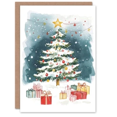 Artery8 Snowy Decorated Tree with Presents Blank For Him Or Her Art Xmas Festive Christmas Card