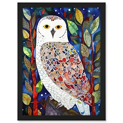 Artery8 Snowy Owl Between Tree Branches Folk Art Artwork Framed A3 Wall Print
