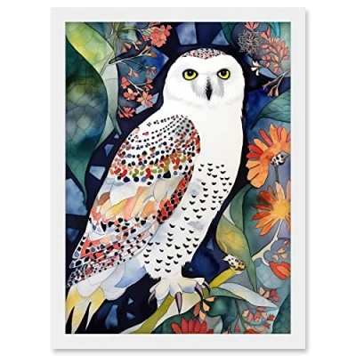 Artery8 Snowy Owl On Blooming Tree Folk Art Artwork Framed A3 Wall Print