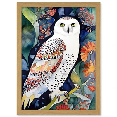 Artery8 Snowy Owl On Blooming Tree Folk Art Artwork Framed Wall Print A4