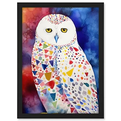 Artery8 Snowy Owl With Multicoloured Spot Feathers Folk Art Artwork Framed A3 Wall Print