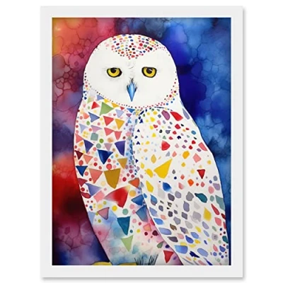 Artery8 Snowy Owl With Multicoloured Spot Feathers Folk Art Artwork Framed Wall Print A4