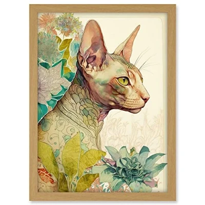 Artery8 Sphynx Cat with Floral Tattoo in Flower Blooms Colourful Modern Watercolour Illustration Artwork Framed A3 Wall Art Print