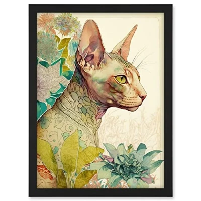 Artery8 Sphynx Cat with Floral Tattoo in Flower Blooms Colourful Modern Watercolour Illustration Artwork Framed A3 Wall Art Print