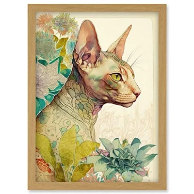 Artery8 Sphynx Cat with Floral Tattoo in Flower Blooms Colourful Modern Watercolour Illustration Artwork Framed Wall Art Print A4