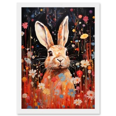 Artery8 Spring Bliss Oil Painting Cute Bunny Rabbit in a Daisy Flower Meadow Kids Bedroom Artwork Framed Wall Art Print A4