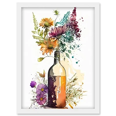 Artery8 Spring Wildflower Bouquet in a Glass Wine Bottle Artwork Framed Wall Art Print A4