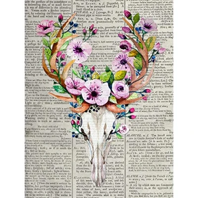Artery8 Stag Skull Flowers Upcycle Style Dictionary Premium Wall Art Canvas Print 18X24 Inch