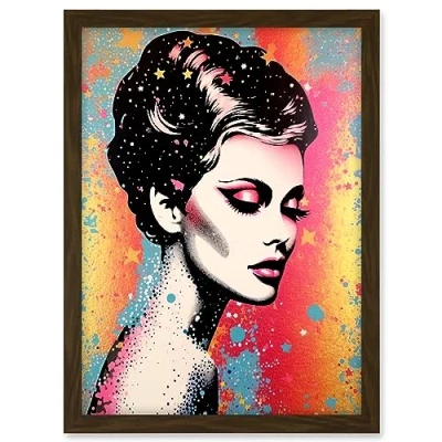 Artery8 Stars in Hair Female Portrait Linocut Blue Yellow Pink Glam Glitter Aesthetic Teen Room Artwork Framed A3 Wall Art Print