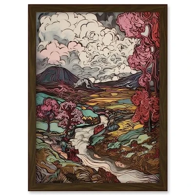 Artery8 Storm Brewing over River Landscape with Pink Trees Artwork Framed A3 Wall Art Print