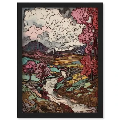 Artery8 Storm Brewing over River Landscape with Pink Trees Artwork Framed Wall Art Print A4