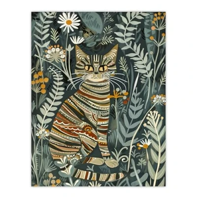 Artery8 Striped Cat in Floral Botanical Garden Folk Art Living Room Extra Large XL Wall Poster Print