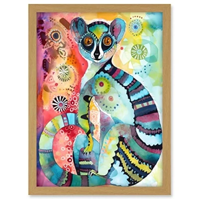 Artery8 Striped Ring Tailed Lemur Multicoloured Folk Art Watercolour Painting Artwork Framed A3 Wall Print