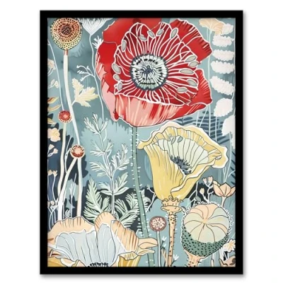 Artery8 Stylised Poppy Flowers Pastel Colour Design Living Room Artwork Framed Wall Art Print A4